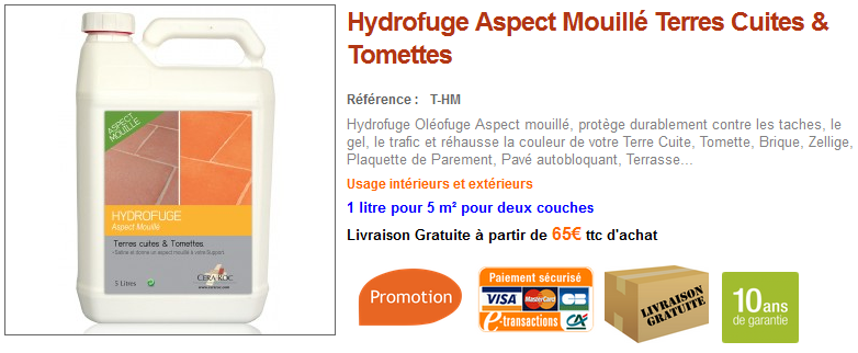 Afin de protéger durablement votre support, nous vous conseillons d’appliquer deux couches d’Hydrofuge Oléofuge Incolore ou Aspect Mouillé Terres Cuites et Tomettes = 1 Litre pour 4 m² pour deux couches.