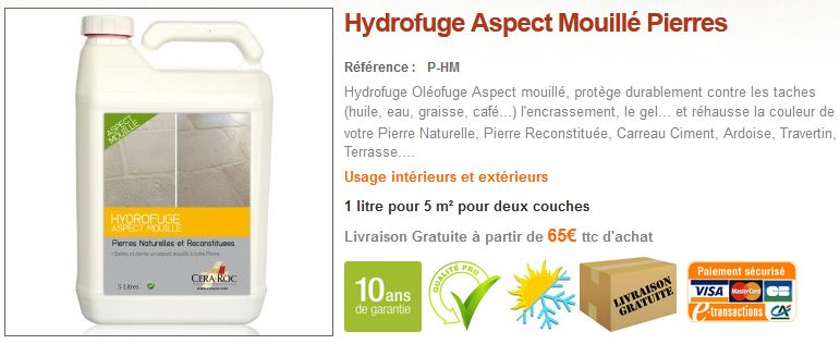Nous vous conseillons d’appliquer notre Hydrofuge Aspect Mouillé Cera Roc afin de raviver et protéger durablement votre Terrasse.    Imperméabilisant Effet Mouillé Pierre