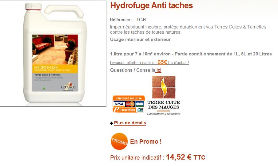Appliquez notre Hydrofuge Oleofuge Anti-taches pour les Terres Cuites, Tomettes, Zelliges, Briques, Terrasses… Facile d’application, incolore et protège durablement votre Terre Cuite pendant plusieurs années.